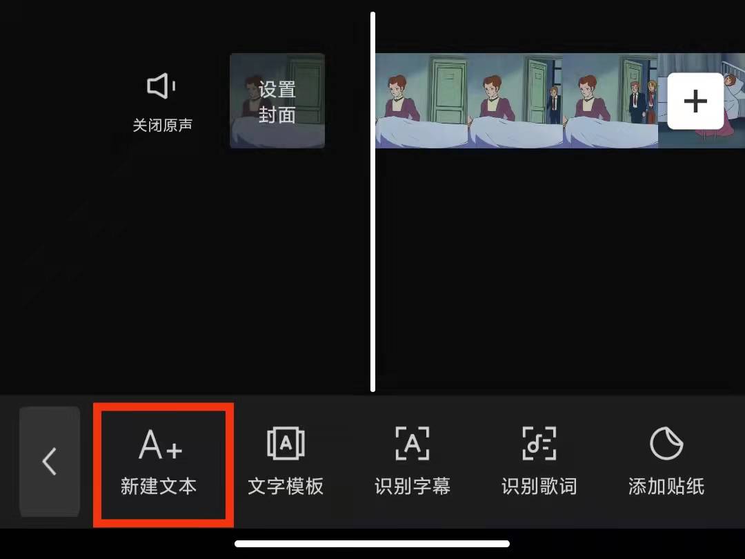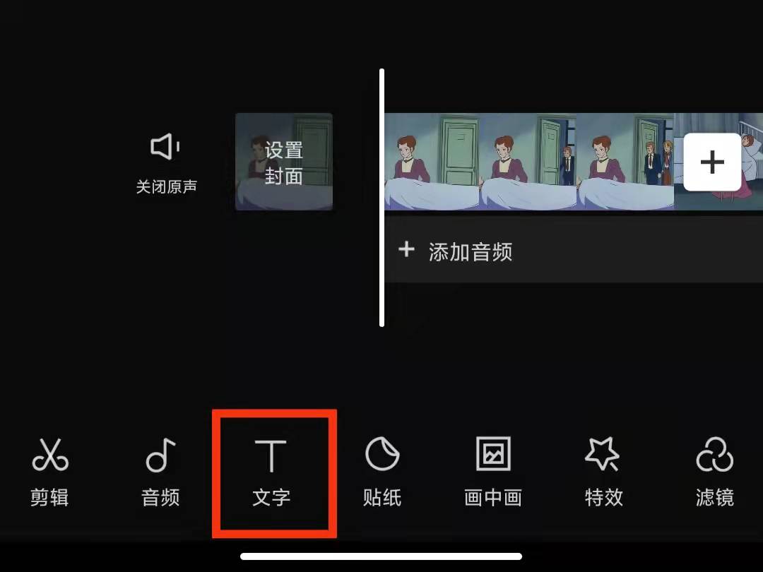 1、打开剪映APP,导入素材后点击视频剪辑页面下方的“文字”。
