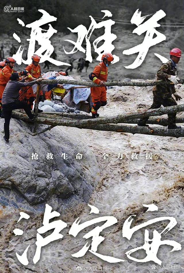 树干搭起生命通道,脚下尽是滚滚急流……抢救生命,全力救援,泸定加油,共渡难关!