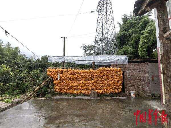 9月8日,爱国村下了雨,常国蓉家的“玉米墙”依然是干的。9月5日,她搬了20多背篓玉米,把玉米几个几个拴成一捆,靠在墙边晾晒,还细心地搭了一个塑料棚,防止玉米被雨淋。中青报·中青网记者 赵丽梅/摄