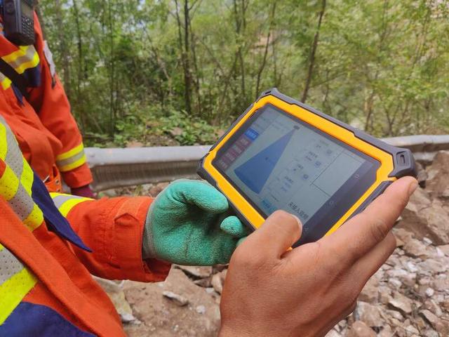 9月8日,攀枝花森林消防支队消防员和金权在利用生命探测仪搜寻常国蓉。姜绍淼/摄