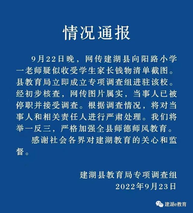 据“建湖e教育”微信公众号消息,建湖县教育局专项调查组9月23日发布情况通报,9月22日晚,网传建湖县向阳路小学一老师疑似收受学生家长钱物清单截图。