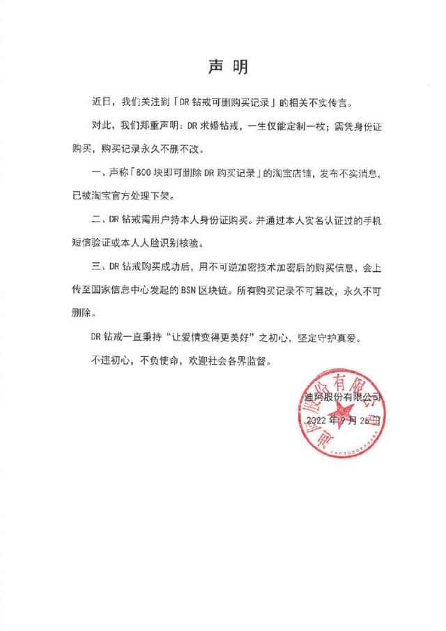 DR在回应中指出,近日,关注到DR钻戒可删购买记录的相关不实传言。对此,DR声明称,DR求婚钻戒,一生仅能定制一枚;需凭身份证购买,购买记录永久不删不改。