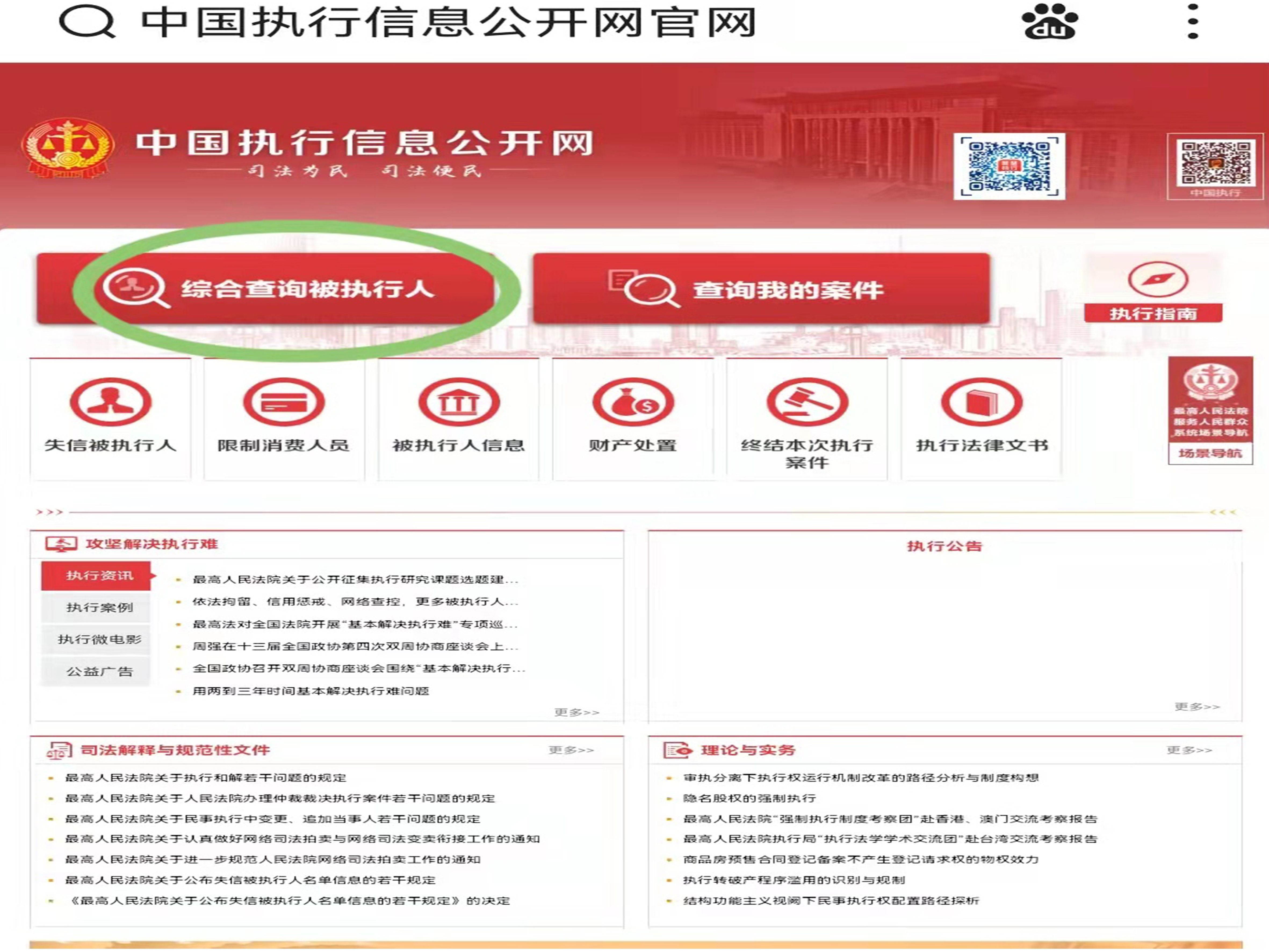 2、在官网首页点击“综合查询被执行人”。
