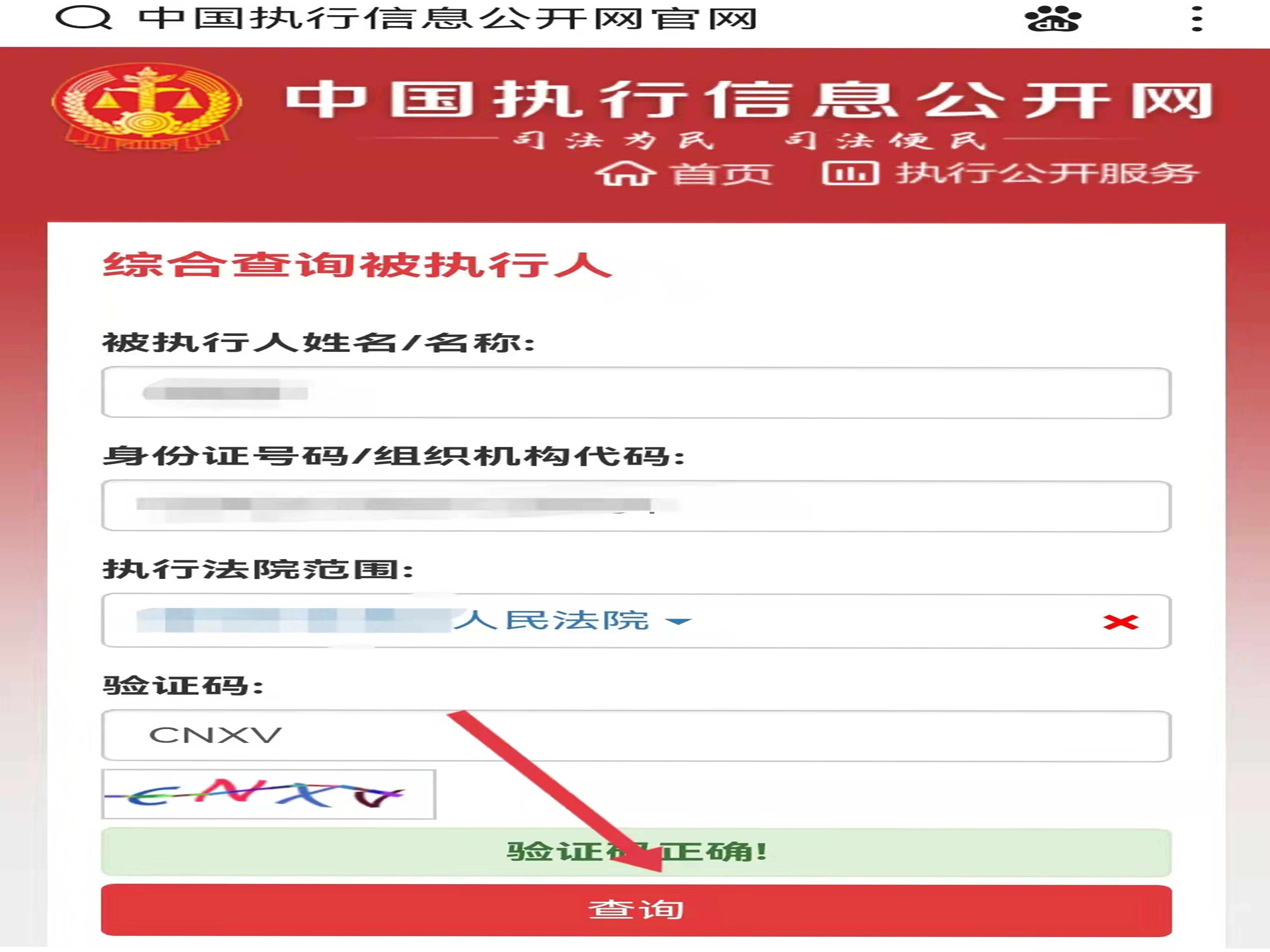 4、输入并确认查询信息,然后点击“查询”,即可查询被执行者信息。