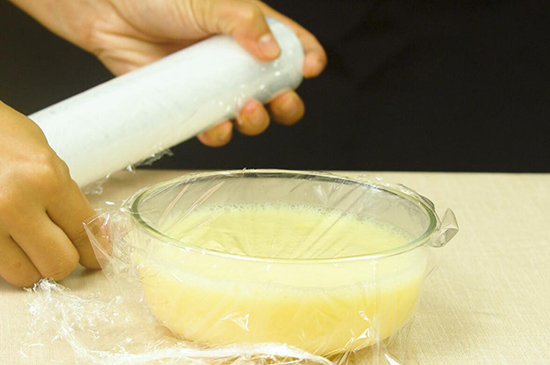 3、用保鲜膜包裹好装有食材的碗,同时用牙签在保鲜膜上扎几个小孔。