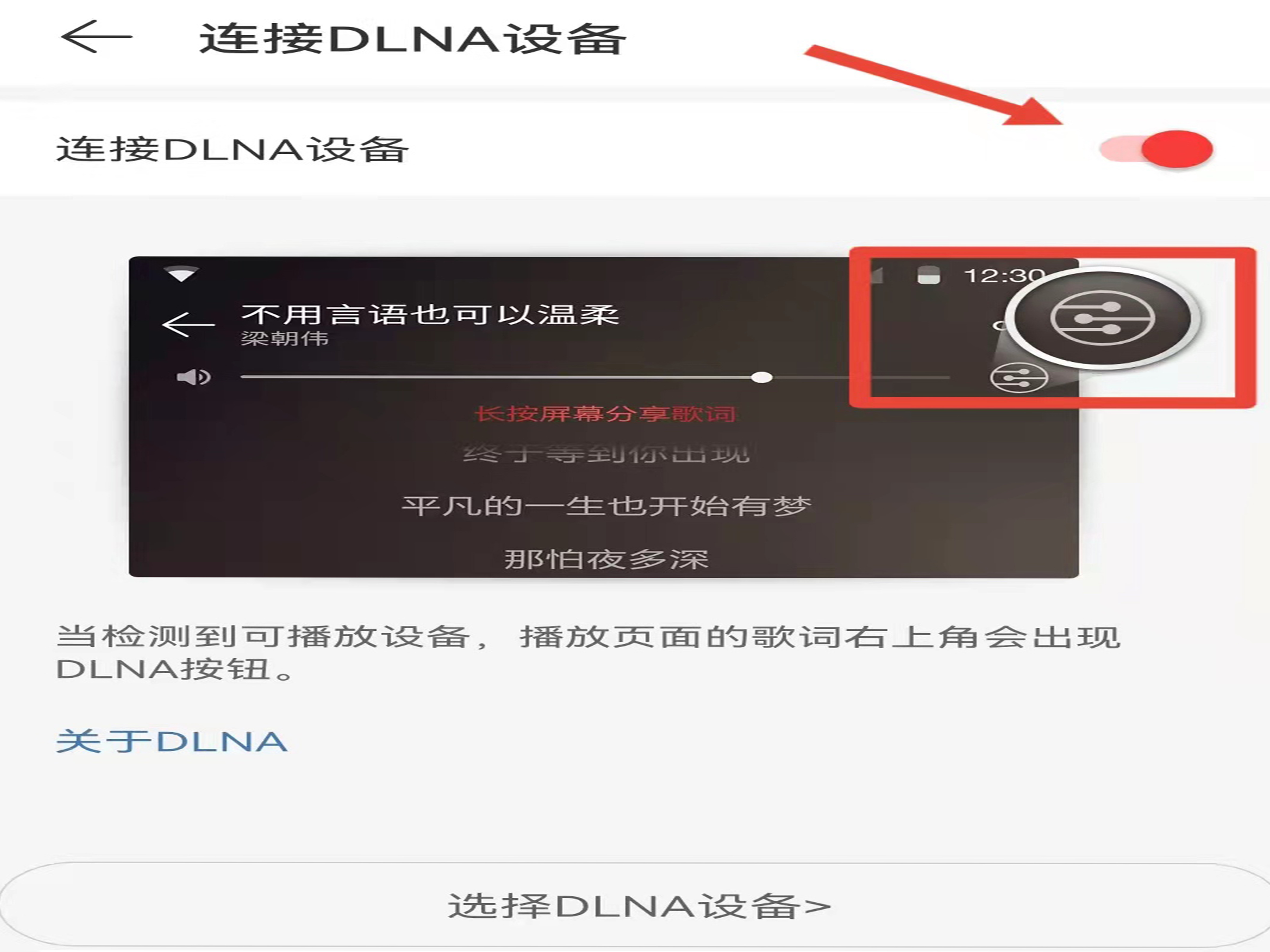 4、点击开启按钮,当检测到可播放设备,播放页面的歌词右上角会出现DLNA按钮。