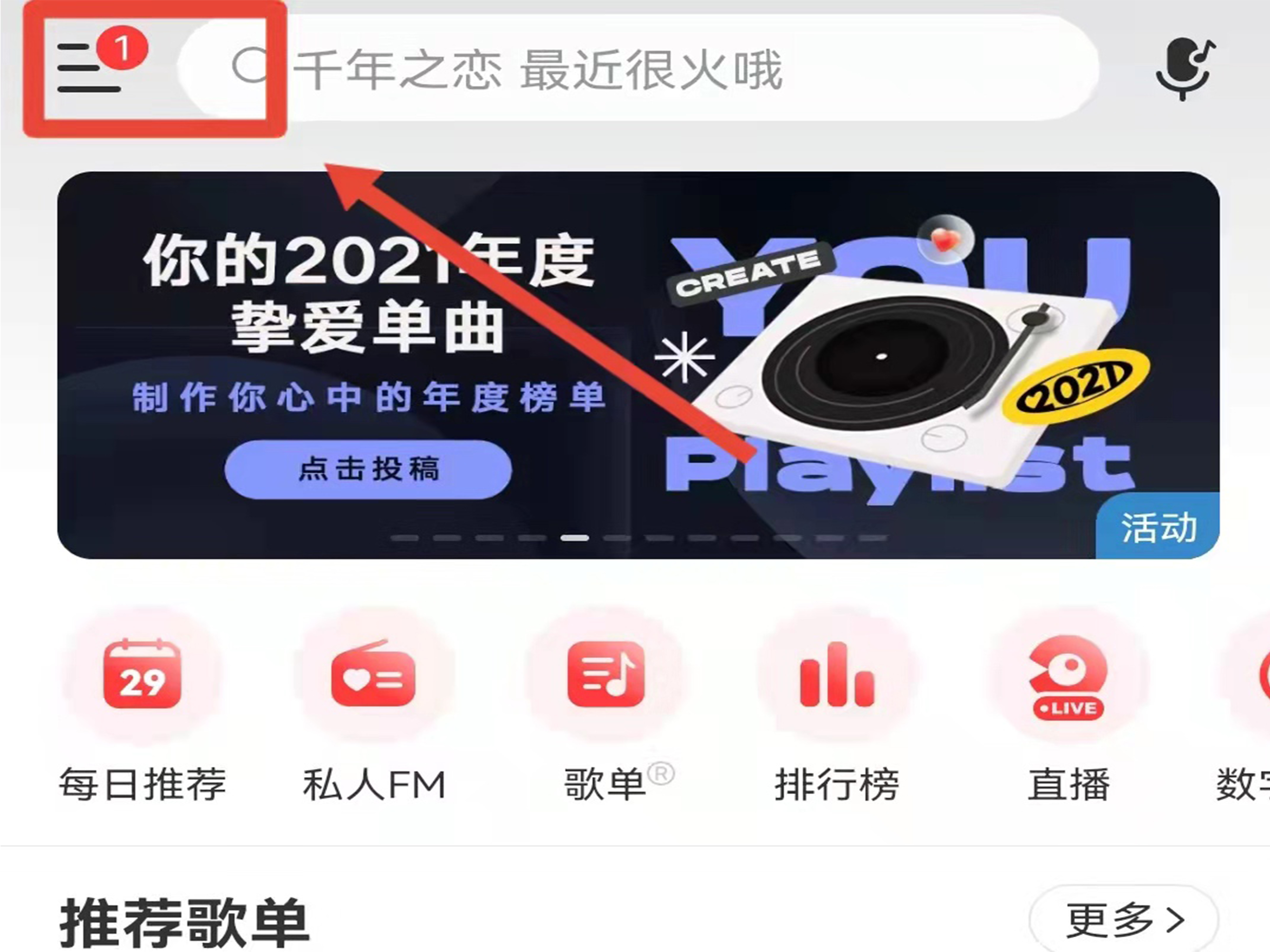 1、打开安卓版网易云音乐软件,点击左上角的“三横”图标。
