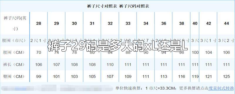 女士裤子29是l码的。码数为29的裤子腰围是二尺二,大约是74厘米的腰围,在男生尺码中对应的是M码,在女生尺码中对应的是L码,女生如果是标准身材,建议身高162cm,体重52公斤的人穿比较合身。