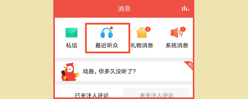 全民k歌是可以看到有谁收听了自己的作品的,首先打开全名k歌后,点击主页中的消息按钮,在消息中找到最近听众,列表就会自动下拉。在下拉的列表中不仅可以看到收听者的名称和ID,还可以看见收听的歌曲以及时间。