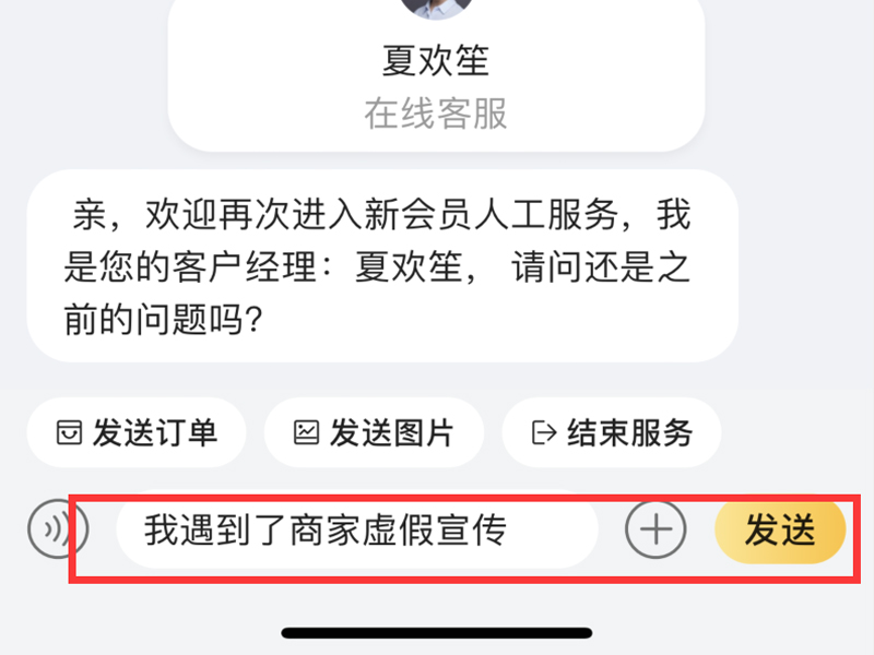 4、在对话框中输入遇到的虚假宣传问题进行投诉即可。