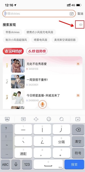 2、然后在“发现搜索”界面,点击右边的小眼睛图标。