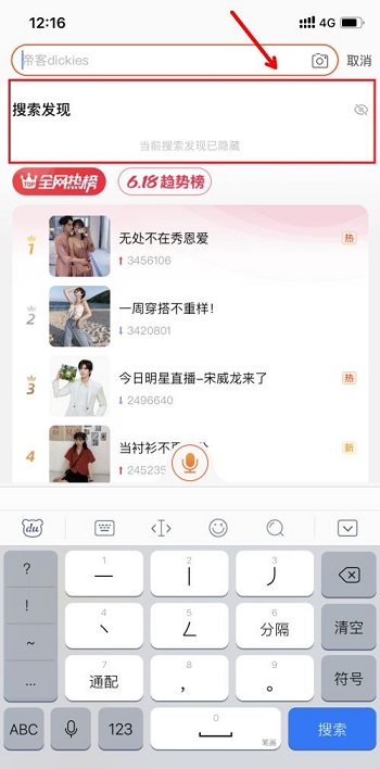 3、关闭小眼睛图标即可隐藏“发现搜索”功能。“发现搜索”是系统自带,无法删除,只能隐藏。