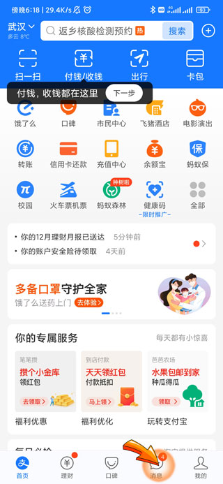 1、支付宝添加好友需要打开支付宝APP,点击页面下方的“消息”图标。