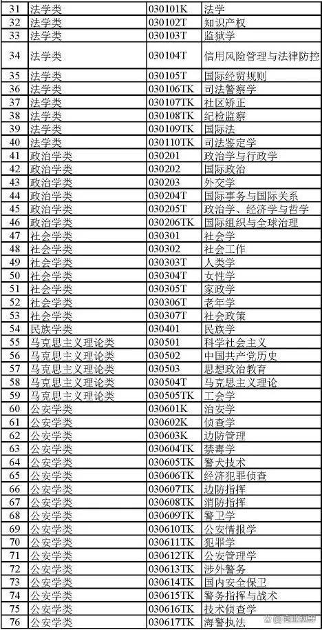 法学门类下有法学、政治学、社会学、民族学、马克思主义理论、公安学等几类。