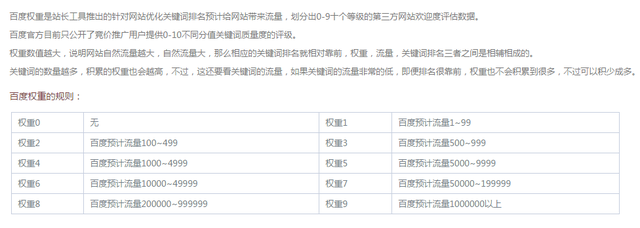权重1:关键词预估流量1~99权重2:关键词预估流量100-499权重3:关键词预估流量500-999权重4:关键词预估流量1000-4999权重5:关键词预估流量5000~9999权重6:关键词预估流量10000~49999权重7:关键词预估流量50000~199999权重8:关键词预估流量200000~999999权重9:关键词预估流量1000000以上