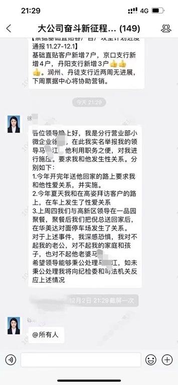各位领导晚上好,我是分行营业部小微企业徐某。在此我实名举报我的领导马某江,他利用职务之便,对我进行施压。要求我和他发生性关系。分别如下: