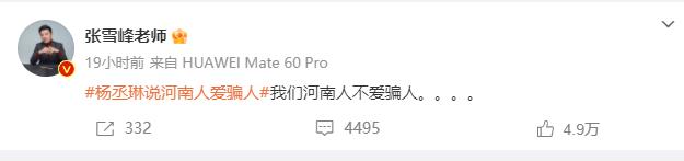 12月10日下午,在#杨丞琳说河南人爱骗人#这一词条下,张雪峰犀利回应:“我们河南人不爱骗人。”据报道,此前张雪峰还曾称,“社会很多人表示咱河南人不中,我第一个不同意。你去过吗?你和多少个河南人接触过?你就听别人说不好,你就说不好?”